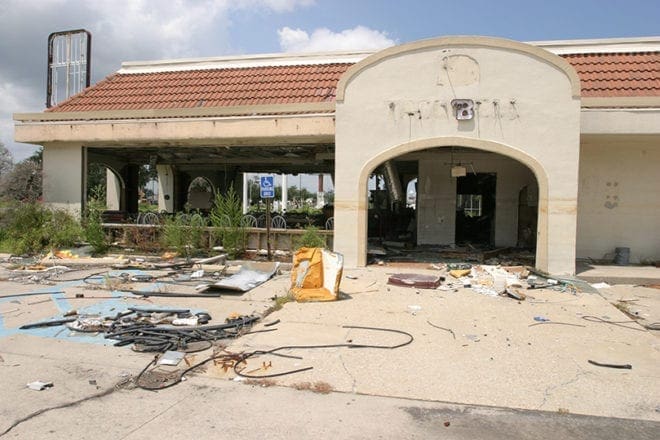 Nearly a year later some neighborhoods in New Orleans’ St. Bernard Parish are like virtual ghost towns where abandoned commercial and residential property remains a vivid reminder of the devastation Hurricane Katrina left behind. Photo by Michael Alexander