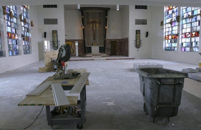 Repairs are underway at the Sisters of the Holy Family Motherhouse and Noviate chapel, New Orleans. In addition to this property, all their buildings, which included a convent, an all girls high school, assisted living facilities, and a nursing home, sustained water damage across the entire first floor. Photo by Michael Alexander