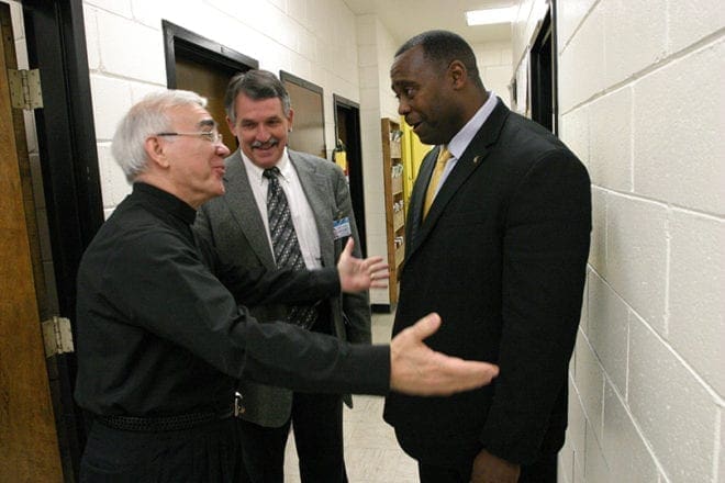 Deacon Tom Silvestri, left, welcomes new warden Hilton Hall, right, during their initial meeting following Mass. Looking on is Georgia Diagnostic and Classification Prison director of chaplains Rev. Stanley Harrell. Photo by Michael Alexander
