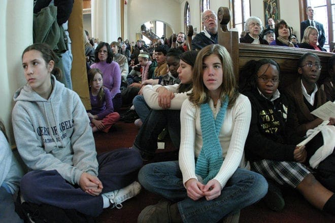(L-r) Annaleah Fernandez, a sixth-grader at Queen of Angels School, Roswell, Hannah Meadows, a seventh-grader at Holy Spirit Preparatory School, Atlanta, and Imani Scott and Renee Martin, eighth-graders at St. John the Evangelist School, Hapeville, sit on the floor of the Shrine of the Immaculate Conception during the annual Mass for the Unborn, Jan. 22. Photo By Michael Alexander
