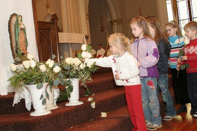 In a procession where each person represented a child born since 1973, the year in which the Supreme Court legalized abortion in the United States, five-year-old Mary Woven places a white rose in a vase at the statue of Our Lady of Guadalupe. Photo By Michael Alexander