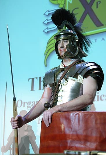 Edge Gibbons is dressed as a Roman centurion. In his right hand he holds a Roman sword known as a gladius and he holds a curved body shield in his left hand. His helmet contains a crest made of horse hair. Centurions were the equivalent of a captain or lieutenant colonel in today’s military. Gibbons is a colonel in the U.S. Army. Photo By Michael Alexander