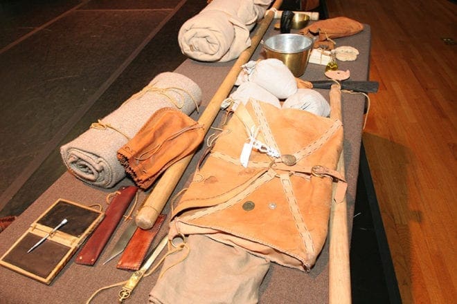 On a table for display is some of the 40 pounds of equipment Roman soldiers carried as they marched approximately 20 miles a day. The fighting armor worn by the soldiers averaged about 45 pounds. Photo By Michael Alexander