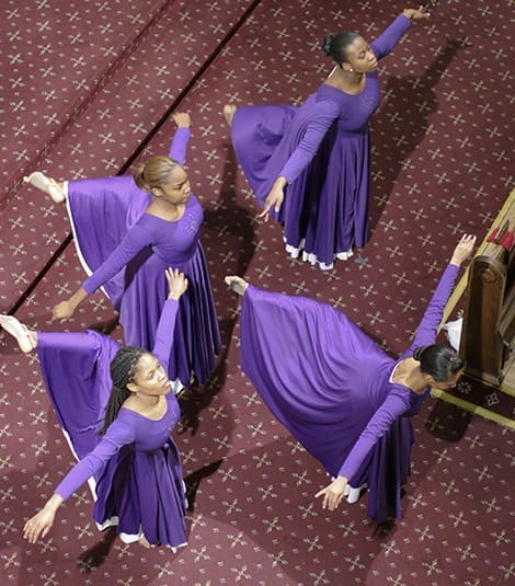 (Clockwise from top) St. Anthony of Padua Liturgical Dancers Angeline Brew, Jore Chumbley, Patrice Eustache and Whitney Farley perform to Walt Whitman’s “Perfect Praise” during the post holy Communion meditation. Photo By Michael Alexander