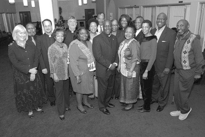 (Front row, l-r) Mass worship leader Lyn Vaughn of Sacred Heart Church joins Black History Month Celebration committee member Janise Miller of Sacred Heart, Father Manuel Williams, CR, committee members Juanesta Phillips-Chapman of Our Lady of Lourdes Church and Mignon Mormon of Sacred Heart; (Back row, l-r) committee members include Kate Oates and Bill Fuller of Sacred Heart, Marist Father Patrick Scully, parochial vicar at Sacred Heart, Father Thomas Meehan, pastor of Sacred Heart, Ann Green of Sacred Heart, James Chisholm of Our Lady Lourdes, Neloise Adkins of Sacred Heart, Betty Derrickson of the Shrine of the Immaculate Conception, and Quentin Whitelaw, Woody Hall and Calvin Williams of Sacred Heart. Photo By Michael Alexander