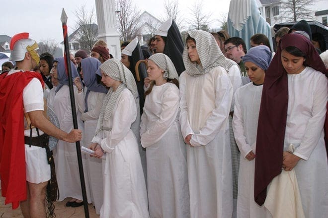 The crowd gathers during the living Stations of the Cross as Jesus is condemned to death. Photo By Michael Alexander