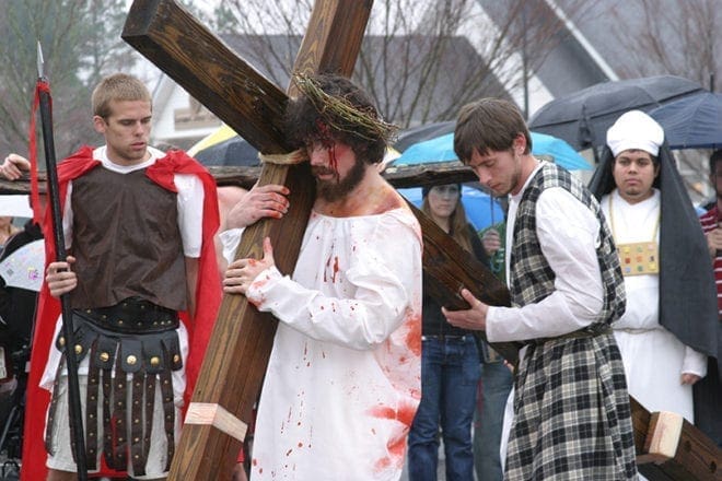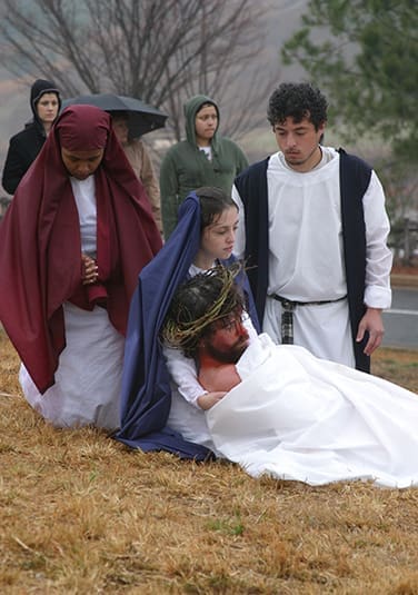 They were unexpectedly witnessing the living Stations of the Cross, as Southern Catholic College students in costume and in somber reflection acted out each moment of the Lenten remembrance March 14 on the neighboring campus.