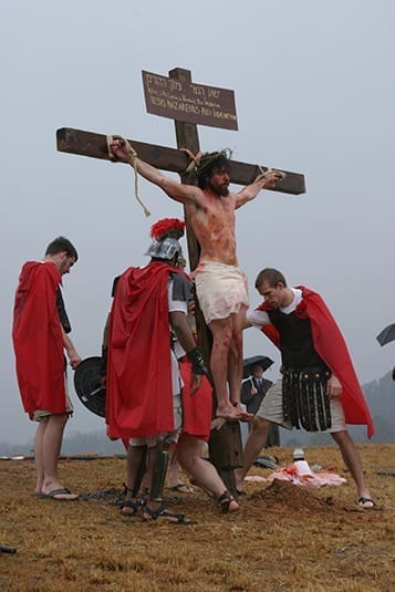 After Jesus is nailed to the cross, the soldiers lift him up for all to see. Photo By Michael Alexander