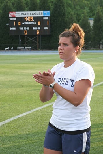 Sara Geiger, first year head soccer coach for St. Pius X High School, urges her team on in the second half of the state finals. Her team became state runner-up after losing to Marist May 10. Photo By Michael Alexander