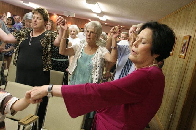 Melody Stancil, right, joins the Catholic community of St. Catherine Laboure in praying the Our Father. Stancil has been a member of the Jackson County church for six years. Photo By Michael Alexander