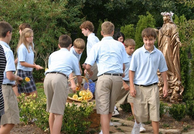 Students place yellow roses in a basket before the statue in the Mary Queen of Angels Garden. The student body recited a decade of the rosary as they dedicated the school’s 10th year of existence to Mary. Photo By Michael Alexander