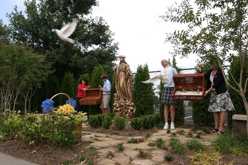 At the conclusion of the blessing all sang the hymn “Ave Maria.” Ten white doves, with a prayer attached to one, were released. The doves are part of a bird sanctuary in Roswell.