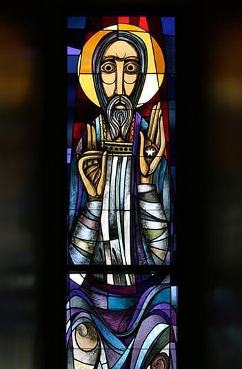 The stained glass image of God the Father is juxtaposed between six other windows, three on each side, representing the days of creation. Photo By Michael Alexander