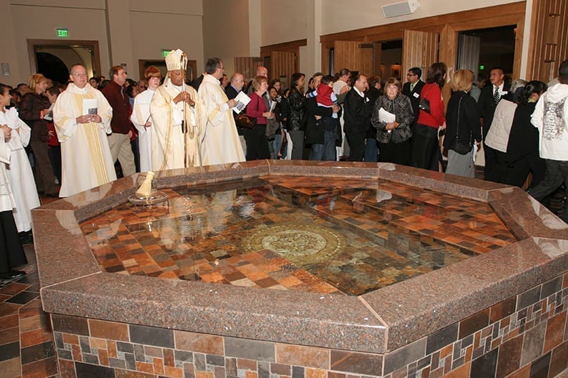 Entering the church, worshippers pass by a large baptismal font based on an ancient design, said Father Jowdy.