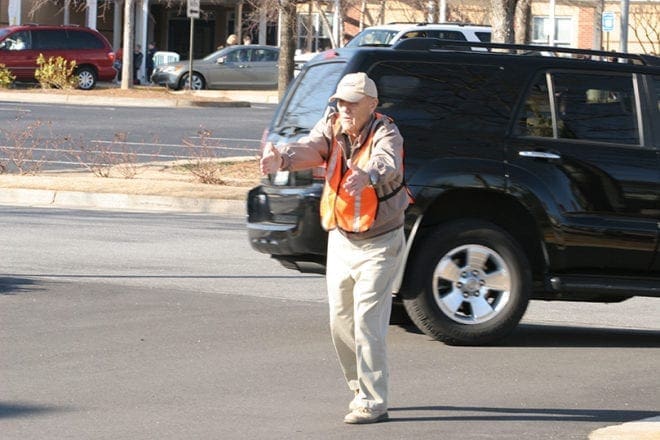 Eighty-seven-year-old Bud Might directs traffic during Queen of Angels School’s afternoon carpool line. Might coordinates a group of seniors from neighboring St. George Village who help out with school’s afternoon carpool line. Photo By Michael Alexander