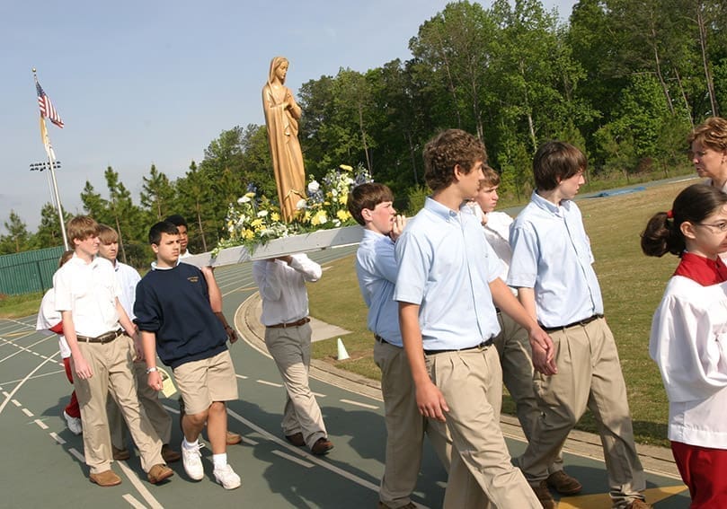 An annual spring eucharistic procession and Mary crowning has become a tradition here, joining all four communities (St. Peter Chanel, St. George’s and Blessed Trinity) on the athletic fields of Blessed Trinity.