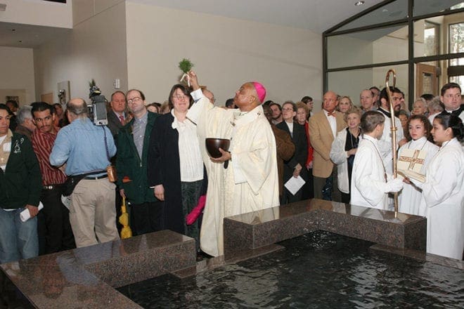 After the doors of the church are opened, Archbishop Wilton D, Gregory proceeds to the baptismal pool where he conducts a prayer and then he sprinkles the church with holy water. Photo By Michael Alexander