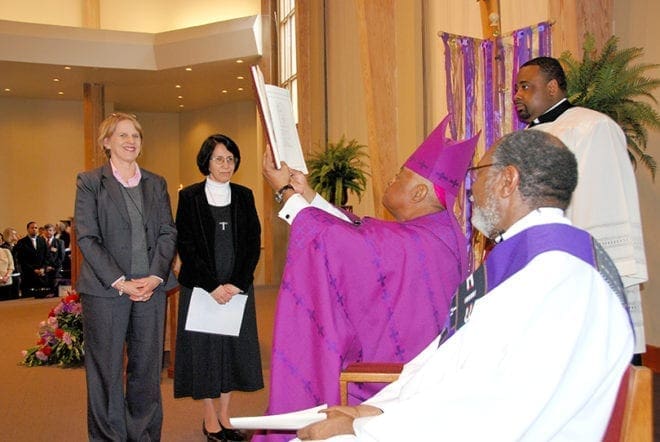 During the Rite of Election, adult formation directors from each of the approximately 20 parishes in attendance presented their Book of the Elect to Archbishop Wilton D. Gregory. The book is inscribed with the name of each catechumen from the parish this year. Assisting Archbishop Gregory were Father Ricardo Bailey, standing, far right, and Deacon Chester Griffin, seated. Photo by Cindy Connell-Palmer/Archdiocese of Atlanta