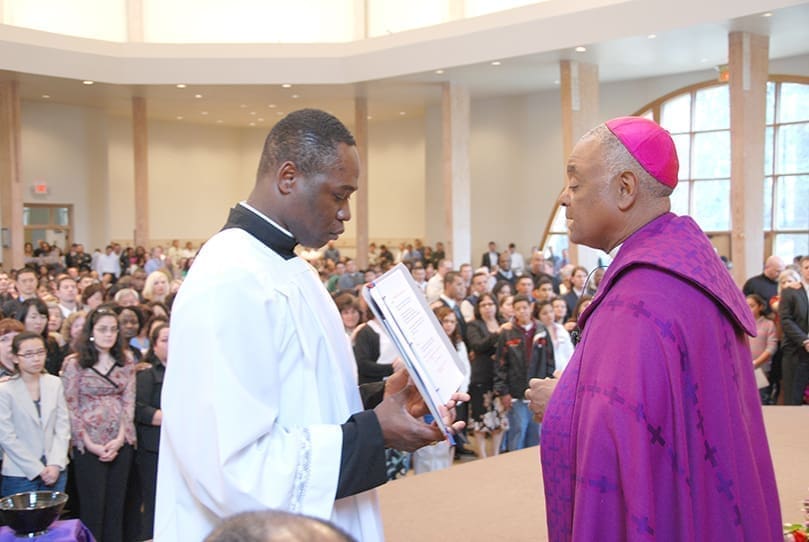 During the Rite of Election, adult formation directors from each of the approximately 20 parishes in attendance presented their Book of the Elect to Archbishop Wilton D. Gregory. The book is inscribed with the name of each catechumen from the parish this year. Assisting Archbishop Gregory were Father Ricardo Bailey, standing, far right, and Deacon Chester Griffin, seated. Photo by Cindy Connell-Palmer/Archdiocese of Atlanta
