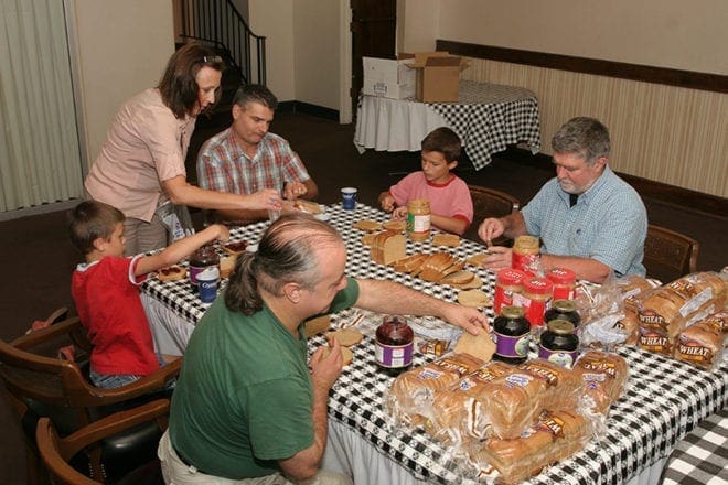 (Clockwise from bottom left) Sean Rogers, the founder of Deep Waters Ministry, seven-year-old Ben Coppinger, Nancy Rader, director of outreach at Sacred Heart Church, Atlanta, Todd Coppinger, his nine-year-old son William, and Father Thomas Meehan, pastor of Sacred Heart Church, Atlanta, all pitch in to make peanut butter and jelly sandwiches for the city’s homeless. Photo By Michael Alexander