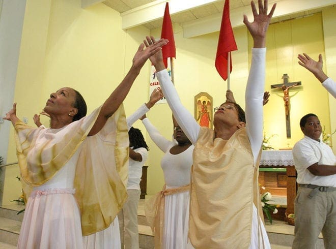 Cassandra Simmons, left, leads a contingent of dancers during a liturgical performance of praise and thanksgiving at Sts. Peter and Paul Church. The Decatur parish marked its 50th anniversary with a special Mass, Aug. 29. Photo By Michael Alexander