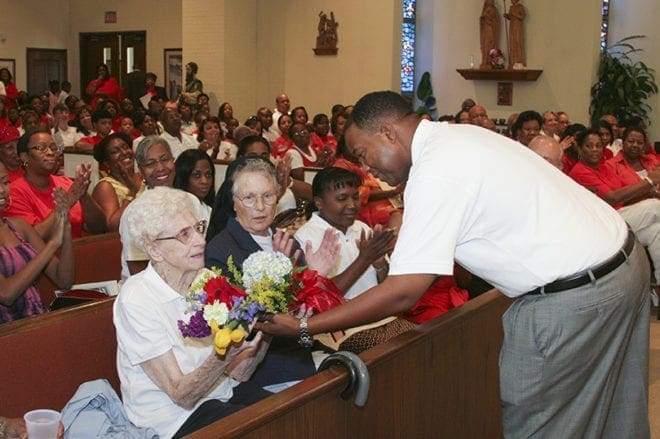 Fiftieth anniversary steering committee co-chair Tony King presents a bouquet of flowers to Agnes Driskell, a parishioner since 1962. Sitting next to Driskell is Immaculate Heart of Mary Sister Alice M. Daly, who served as pastoral associate from 1988-1996. She traveled from Philadelphia, Pa., to attend the celebratory Mass. Photo By Michael Alexander