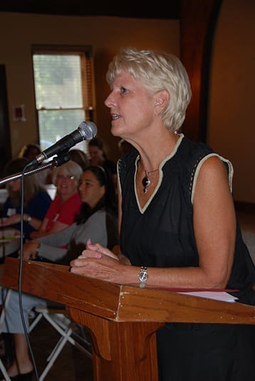 Terry Graham, coordinator of the office of parish-based early childhood programs, welcomes more than 300 preschool directors and teachers, representing some 30 preschools in the Archdiocese of Atlanta, to the Aug. 15 preschool institute. Photo By Cindy Connell Palmer/Archdiocese of Atlanta