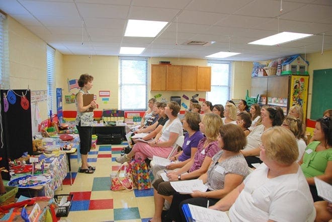 Pat Roberts, left, leads a session for an attentive crowd on “A Million $$$ Classroom on a Dollar Budget.” She is the director for one of the newer preschools in the archdiocese, St. Joseph Church in Marietta. Photo By Cindy Connell Palmer/Archdiocese of Atlanta