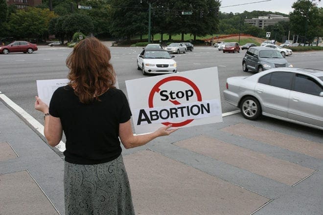 Standing at the intersection of Ashford Dunwoody Road and Hammond Drive, Noreen Coughlin, coordinator for the DeKalb County chapter of Georgia Right to Life, holds up signs before passing motorists. Photo By Michael Alexander