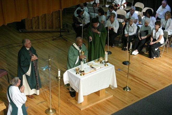 Nearly 700 people filled the Calhoun Civic Center as Archbishop Wilton D. Gregory presided over an anniversary Mass there on Sept. 13. Concelebrants included the current pastor, Father Joseph Shaute, and a former pastor, Father Jim Henault, representing LaSalette priests who served the parish for decades.