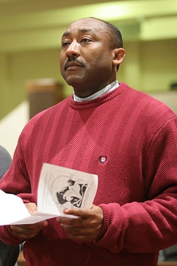 Joseph Alfred stands for the Prayers of the Faithful, which were intended for to the victims of the earthquake in Haiti, the Haitian Catholic community of Saints Peter and Paul Church and their relatives and friends on the Caribbean island. Alfred’s brother, a priest in downtown Port-Au-Prince, is among the thousands of people who remain missing. Photo By Michael Alexander