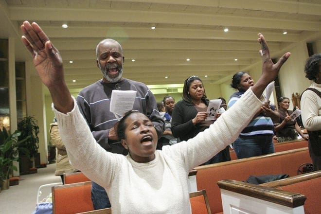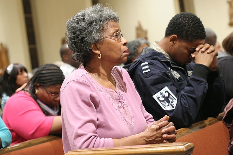 Junie Auguste, sitting foreground, a member of the Haitian Catholic community of Saints Peter and Paul Church, prays with fervor as the congregation sings “How Great Thou Art” during the hymn of thanksgiving. Standing immediately behind her is fellow member Edouard Salvant. Photo By Michael Alexander