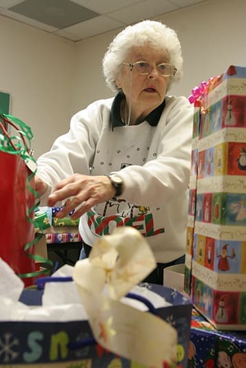 Bobbie Liles of Corpus Christi Church, Stone Mountain, helps sort and bag some 280 Christmas gifts for 170 needy families and senior citizens. Photo By Michael Alexander