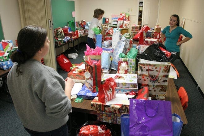 (Counter-clockwise, from bottom left) Robin Nevetral, a 2009 graduate of the University of Georgia, Athens, gives some instructions to her younger sister Rebecca, a sophomore at Georgia College and State University, Milledgeville, as Shelia Govignon checks to ensure that each child is receiving two gifts. The Nevetrals, along with their brother Greg, have volunteered with the parishÕs annual Christmas project for the last seven years. Photo By Michael Alexander