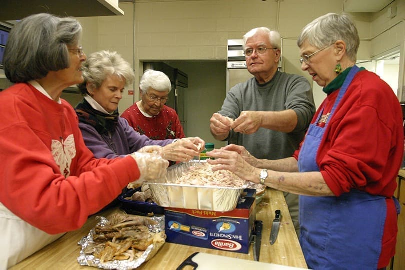 On Dec. 7, Mary Kimpton, a veteran with the cooking ministry, and seven others bump into each other around the kitchen as they tear meat from the bones of three cooked turkeys, prep some 24 pounds of green beans and heat three large pots of water for five pounds of pasta.
