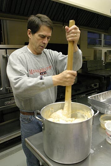 David Kempton stirs the sauce that will go into the main dish, turkey tetrazini. Photo By Michael Alexander