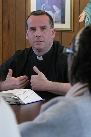 Father Eric Hill, 37, participates in the Saturday morning Bible study class. Upon completion of his spiritual formation and pastoral training at Saint Vincent Seminary, Latrobe, Pa., the Crown Point, Ind. native was ordained in June 2000. Photo By Michael Alexander