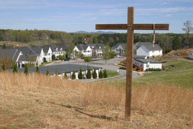 One of three crosses remains on a hill overlooking Southern Catholic College, Dawsonville, from its March 26 Living Stations of the Cross. Nearly 250 students, faculty and staff returned to the school on April 12 following spring break. A 10 a.m meeting with the school’s president, Legionaries of Christ Father Shawn Aaron, provided additional details following last week’s announcement that the college would end its semester April 15 instead May 13 due to lack of funds. Photo By Michael Alexander