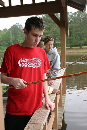 Fifteen-year-old Michael Feliu of St. Oliver Plunkett Church, Snellville, fishes with a bamboo pole in Lake Selig. Photo By Michael Alexander