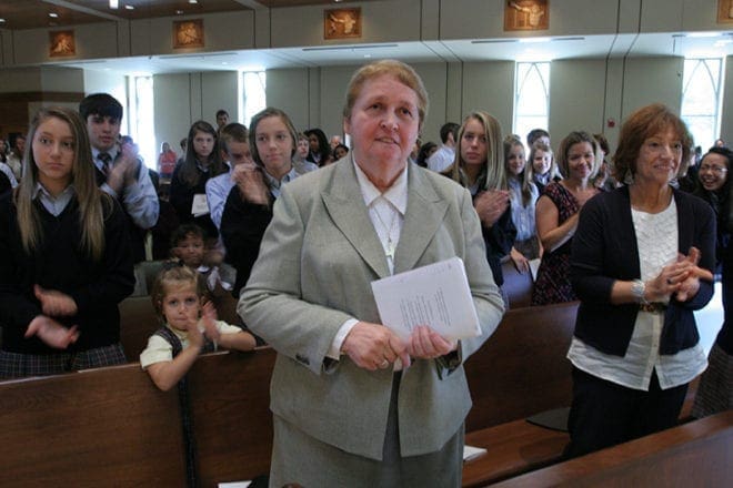 After accepting St. John Neumann School’s gift of $2,770.00 to the Grey of Nuns of the Sacred Heart and offering some remarks to the congregation, Sister Dawn Gear, the school’s founding principal, returns to her pew with a rousing ovation. Photo By Michael Alexander