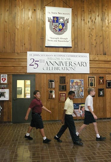 A banner hangs overhead commemorating St. John Neumann School’s 25th anniversary. Photo By Michael Alexander
