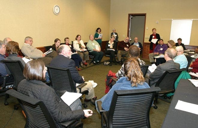 As groups gathered in the afternoon by faith tradition, Karen Clifton, standing right, executive director of the Catholic Mobilizing Network To End The Use Of The Death Penalty, Washington, D.C., leads a discussion among Catholics in attendance. Photo By Michael Alexander