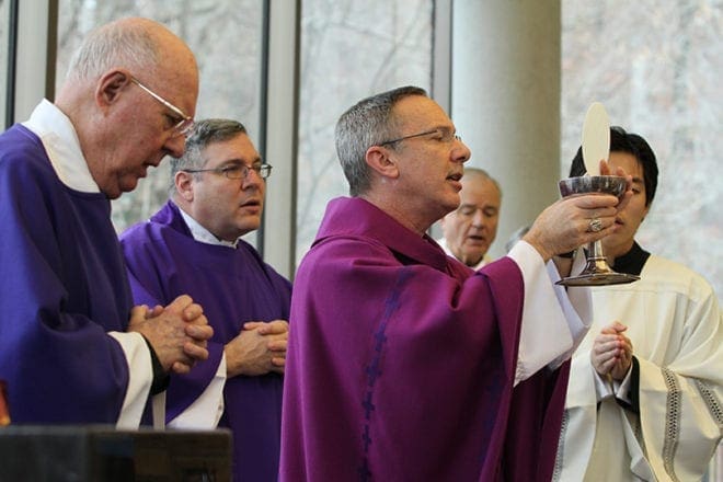 Holding the body and blood of Christ, Bishop Luis Zarama leads the Great Amen during the 50th anniversary Mass for Ignatius House Retreat Center, Atlanta. Photo By Michael Alexander