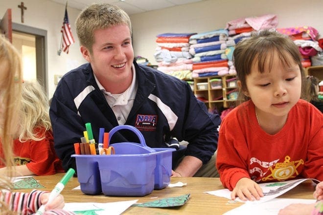 Pre-kindergarten student Joeleane Vo, right, and her classmates get a visit at their table by Carroll College sophomore defensive end Will Wright. Players and coaches from the Montana Catholic college popped in and out of classrooms on the elementary school wing as they spent time with students. Photo By Michael Alexander