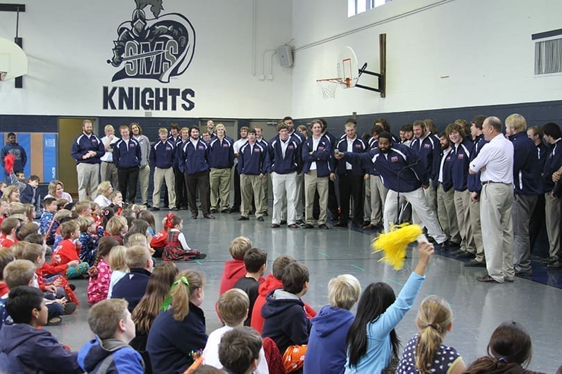 Welcomed by a very enthusiastic group of students, 60 or so players and 10 coaches entered the school gym to the music of Gary Glitter’s “Rock and Roll Part 2” (“The Hey Song”) and syncopated chants of “Carroll College—Fighting Saints—Carroll College—Fighting Saints!” The players were moved by the adulation and outpouring of support.