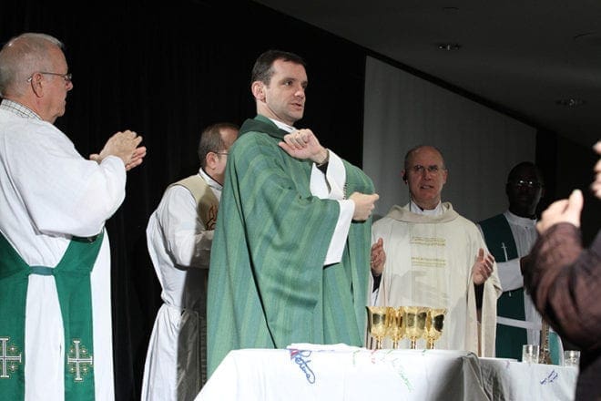 Father Shawn Carey, center, assistant director of the deaf apostolate for the Archdiocese of Boston leads the congregation as they pray the Our Father in American Sign Language. Joining Father Carey on the altar are (l-r) Deacon Bill Koch and Redemptorist Father Leonard Broniak of the Archdiocese of the St. Dominic Deaf Center, Houston, Texas, Bishop Kevin Rhoades, Bishop of Fort Wayne-South Bend, Ind. and Episcopal Moderator for the NCOD, and NCOD board of director Fr. Paul Zirimenya of San Francisco, CA. Photo By Michael Alexander