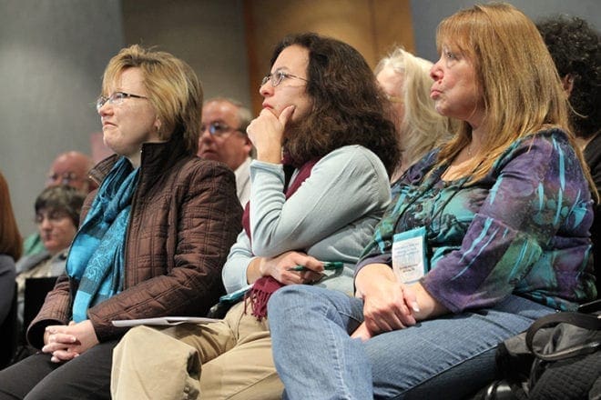 (L-r) Michelle Klinger, Christine Eckel, and Cyntthia Quattrone watch during the morning presentation given in American Sign Language. All three hearing impaired women are members of Transfiguration Church, Marietta. Photo By Michael Alexander