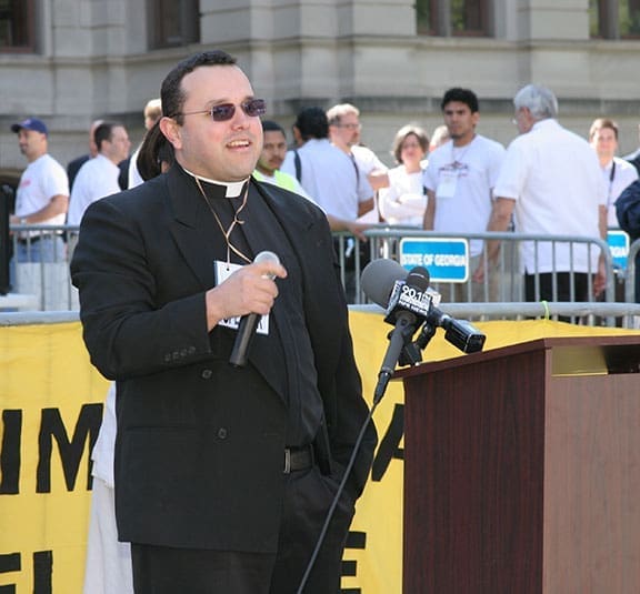 Father Carlos Vargas Silva, parochial vicar at St. Andrew Church, Roswell, and a native of Colombia, South America, addresses the crowd of thousands during the immigration rally in downtown Atlanta. Photo By Michael Alexander