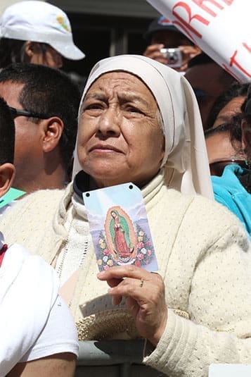 Missionary Sister of the Sacred Heart Veronica Ramos holds an image of Our Lady of the Guadalupe in her hand as she joins the March 24 immigration rally. Photo By Michael Alexander