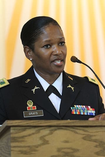 Col. Deborah B. Grays, Garrison Commander, shares some remarks with the congregation during the decommissioning of the Cantonment Chapel. Photo By Michael Alexander